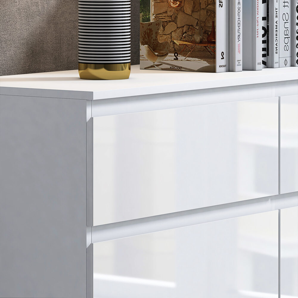 The Carlton chest of drawers features gloss drawer fronts with a matt frame, allowing it to seamlessly complement any room or office decor.