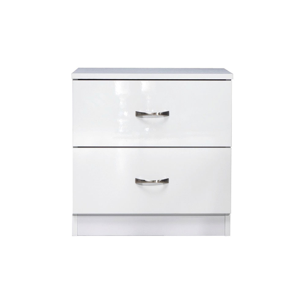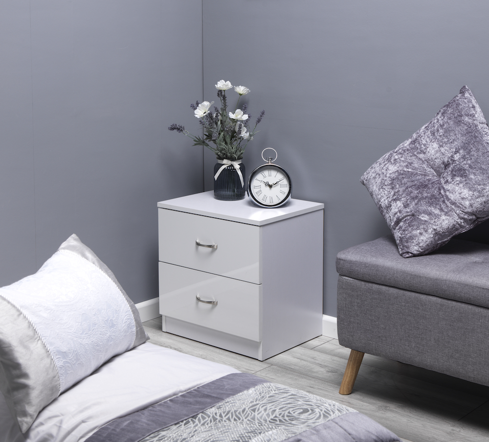 2 drawer bedside cabinet finished with gloss white drawer fronts and matt white frame.