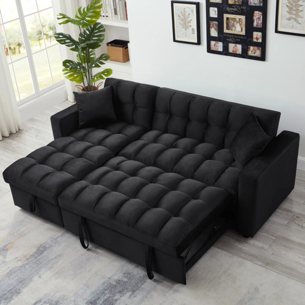 Madrid Velvet Pullout Sofa Bed in Black with Storage Chaise