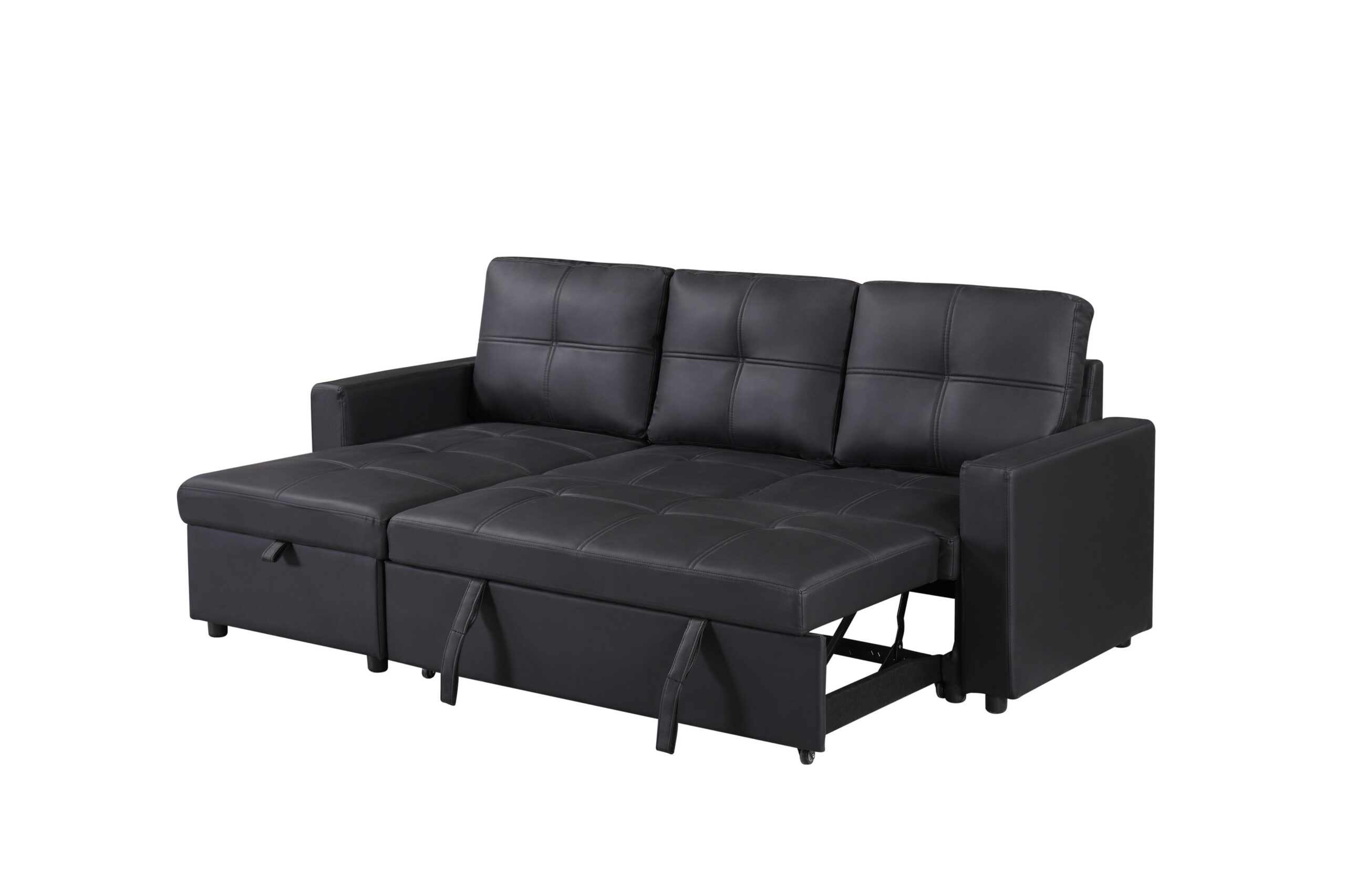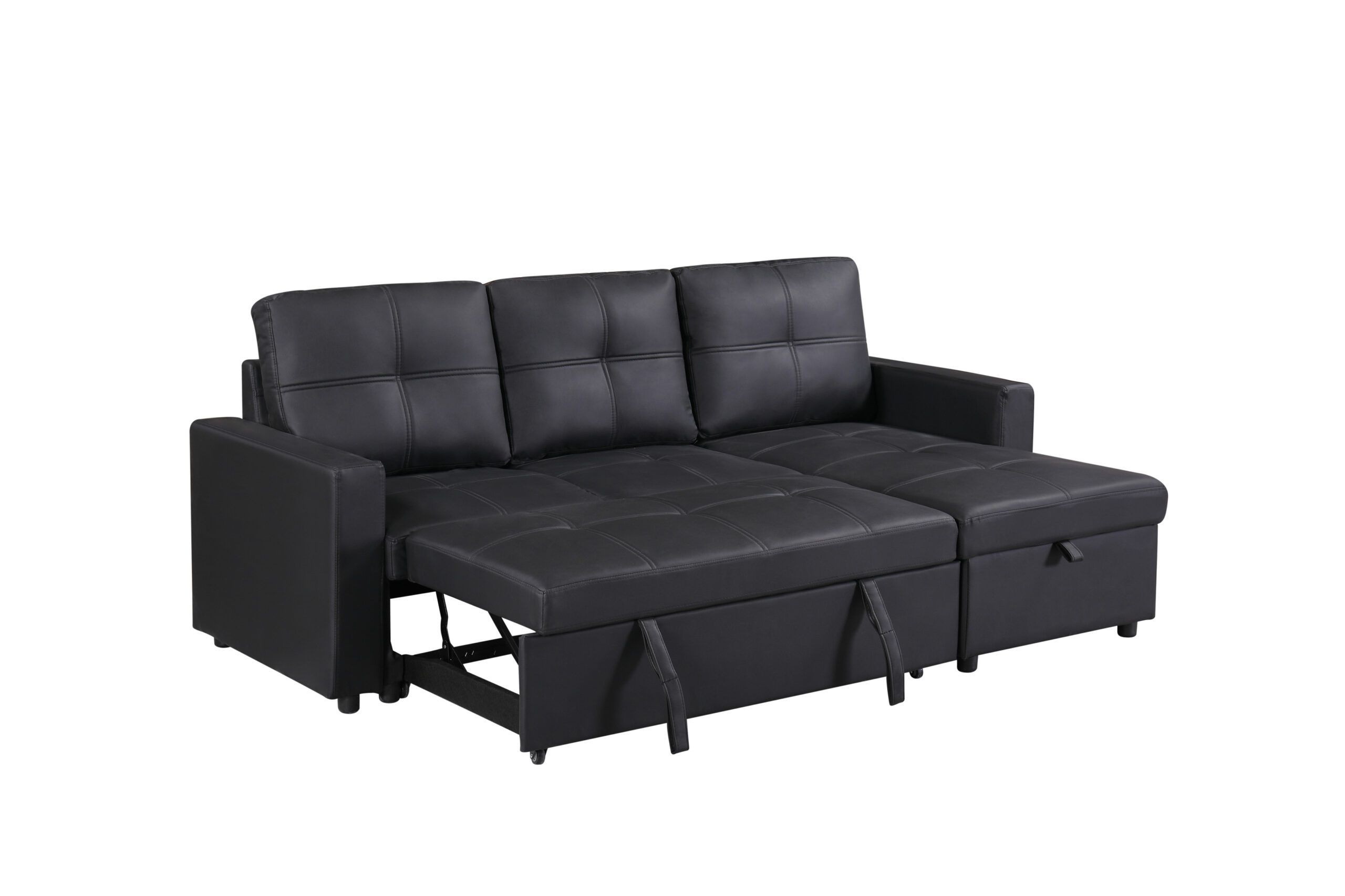 Newport Leather Pullout Sofa Bed in Black with Storage Compartment